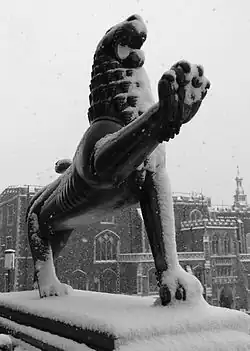 The architects designed for Norwich an Art Deco public building of national significance. It was built to the highest standards, using superior materials and methods of its day. Even the bricks were specially made, each one being two inches longer than usual to better reflect the proportions of the finished building. Charles Holloway James and Stephen Rowland Pierce engaged Alfred Hardiman as their consultant sculptor.[6] He contributed the iconic lions passant which guard the building, and three figures of Recreation, Wisdom and Education outside the Council Chamber. His colleague James Woodford designed the six main bronze doors, incorporating 18 roundels showing the history and industry of Norwich.[7] Eric Aumonier carved the city arms above the Regalia Room window on Bethel Street,[1] and Margaret Calkin James provided textiles for some of the important rooms.[8]