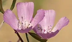 Clarkia dudleyana is a species of flowering plant in the evening primrose family known by the common name Dudley's clarkia. It is endemic to California, where it can be found in the mountains of the Transverse Ranges and the southern Sierra Nevada foothills. It grows in woodland, forest, and chaparral habitats under 1,500 meters in elevation. This annual herb produces an upright stem which sometimes exceeds half a meter in height. The leaves are lance-shaped, up to 7 centimeters long, and borne on short petioles. The top of the stem is occupied by the inflorescence, which has opening flowers below closed, hanging buds. As the flower blooms, the pink to reddish-purple sepals remain fused, opening along one side only. The petals are up to 3 centimeters long, fan-shaped, pinkish lavender in color and sometimes flecked with red. There are 8 stamens, some of which have large lavender anthers and some that have smaller, paler anthers. The stigma protrudes further than the stamens.