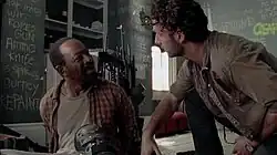 Meanwhile, Morgan wakes up, and instinctively tries to stab at Rick before Rick calms him down. They both apologize for failing to keep in contact by walkie-talkie after Rick left. Morgan mourns the loss of his son, Duane, when he was bitten by Morgan's undead wife, which he could not come to dispatch in time. Since then, he has found a purpose by keeping the town center and nearby buildings clear of walkers. Rick insists he come with them to the prison, but Morgan refuses, not wanting to watch everyone die. He does allow Rick to take some of his weapons.