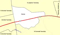 Cleona is bordered to the north and east by North Lebanon Township (1.7 mi), to the south by North Cornwall Township (1.86 mi), and to the west by North Annville Township (0.37 mi) and Annville Township (0.47 mi).
