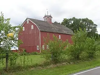 The barn is a gambrel-roofed frame building. The barn is 80 feet (24 m) long by 40 feet (12 m) and 44 feet (13 m) high. The eaves are 27 feet (8.2 m) above the ground. A cupola is centered on the roof. The exterior of the barn was originally red siding with white trim along the roof and down the corners. In the 1950s a white gypsum siding was placed over the original wood siding. The foundation is built of cut stone hauled from Joliet Prison in Joliet, Illinois.[3] There are two large sliding doors located in the middle of the north and south walls. These doors have been altered from their original position and several small doors have been added.[3] All the windows are original. Each is a pedimented, double-hung sash windows with six over six lights. Fourteen are on the lower half of the barn (North 6, East 1, South 6, West 1) with the remaining 8 higher on the walls.[3] A number of fixed sash windows were added in the 1950s,[3] but have been removed by the summer of 2014.[4] The gambrel roof is covered with cedar shake shingles.[3] The cupola has shuttered windows all four directions with four gables. A metal trim tops each gable.[4]