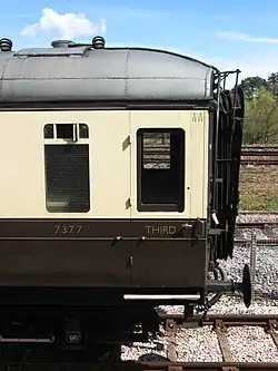 The livery of early carriages was a dark chocolate brown but from 1864 the upper panels were painted white which became a pale cream after being varnished and exposed to the weather. These panels were later painted in cream to give a similar effect. From 1908 carriages were painted chocolate brown all over but this changed to a red lake colour in 1912. A two-colour livery reappeared in 1922, now with a richer shade of cream on the upper panels and chocolate brown below. Certain vehicles such as parcels vans and horse boxes, which were allowed to run in passenger trains, were often painted in just chocolate brown when the passenger carrying coaches were in chocolate and cream, and so this non-passenger carrying coaching stock came to be known as "brown vehicles".[3]