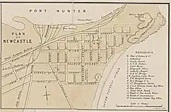 Map of Newcastle in 1868. The locations of coal staithes and the six steam cranes on the Government Wharf (Queens Wharf) are shown.[56]
