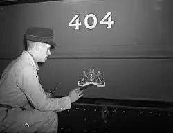 A painter painting the new coat of arms of Amsterdam with motto on one of the city's trams in 1948