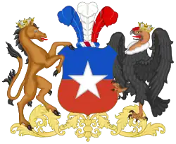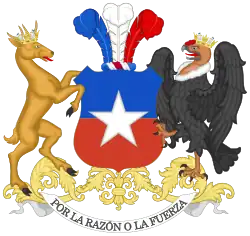 In 1832, Joaquín Prieto commissioned the creation of a permanent coat of arms for the Republic.[3] Charles Chatworthy Wood Taylor, an English artist, was designer of the coat that included a field party per fess, blue and red, with a condor and a huemul for supporters and three feathers with the national colors of Chile, that symbolized the feathers that the President and Supreme Director used on their hats as a symbol of power.