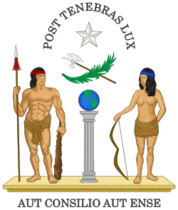 1813—1814 The first arms depicted a doric column with a globe at its top, with a native man and woman as supporters, a wreath, a halbert, a star and the two mottoes in Latin Post tenebras lux and Aut consilio aut ense.
