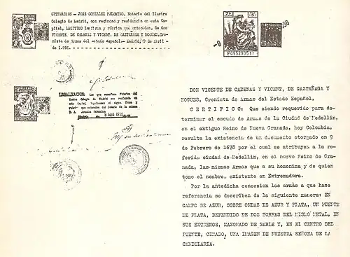 I CERTIFY: That being required to determine the Coat of Arms of the City of Medellín, in the old Kingdom of New Granada, today Colombia, it results the existence of a document granted on February 9, 1678 by which is attributed to the referred city of Medellín, in the New Kingdom of Granada, the same arms that its homonym and from whom it took the name, existing in Extremadura. By the aforementioned concession the arms referred to are described as follows: IN A FIELD OF AZURE, ON WAVES OF AZURE AND SILVER, A SILVER BRIDGE, DEFENDED BY TWO TOWERS OF THE SAME METAL, AT ITS ENDS, MAZONADO OF SABLE AND, IN THE CENTER OF THE BRIDGE, CRESTED AN IMAGE OF OUR LADY OF CANDLES.
