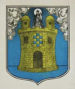 Version of the coat of arms of Medellín from the beginning of the 20th century.[note 4] The Antioquian Academy of History referred to this type of version of the coat of arms in the ruling sent to the Mayor, where it recommended that the arms of the city be copied exactly from the royal decree, since "it is observed that (in the coat of arms of that time) innovations have been introduced that are not in the original. For example, in this version, the towers end in domes and the Virgin rests directly on the tower, details that the coat of arms did not originally have.