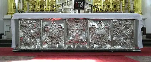 Coat of arms of Medellín located in the Basílica de la Candelaria, the old cathedral of the city. It has a closed crown as a bell. Aesthetically it has similarities with the coat of arms of the Archdiocese of Medellín established in 1958.