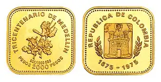 Both coins are of the same design, only the size and face value vary, they are made in gold law 0.900, are square in shape, and have the values of 1,000 and 2,000 Colombian pesos. The coin of the first value has a dimension of 17.5 x 17.5 mm and weighs 4.25 grams, and the second has 21 x 21 mm and weighs 8.5 grams.[31] On the obverse, the central figure is the "Coat of Arms of Medellín" flanked by olive branches; around the coat of arms, on the upper part is the legend "REPÚBLICA DE COLOMBIA" and on the lower part the years "1675 - 1975". On the reverse, the central figure is a bouquet of orchids, around it is the legend "TRICENTENARIO DE MEDELLÍN" at the top, and at the bottom is the value in letters and numbers, and "900/1000 ORO" indicating the purity of the metal.[31] A total of 8,000 pieces were minted, of which half were for 1,000 pesos and the rest for 2,000 pesos.[32] They are also the only two square-shaped Colombian coins.