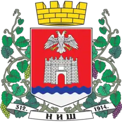 Small coat of arms is just shield with eagle, Niš Fortress and Nišava river in Serbian colors (red, blue, white).[2]