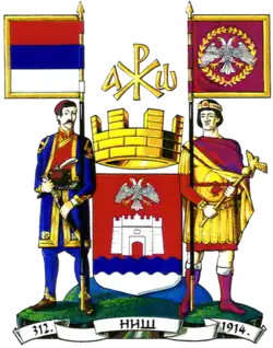The larger coat of arms has two supporters, Stevan Sinđelić (leader of first Serbian Uprising) and Constantine the Great (Roman emperor born in Niš) holding two flags, Serbian flag with cross and four stylised letters "S" (same flag is used by Serbian Orthodox Church) and purple flag with laurel wreath and two-headed eagle. Underneath them is compartment represented by plains and motto with name of the city in Serbian, Greek and Latin representing history of the city. In the middle there is an escutcheon painted in Serbian colors (red, blue and white). In the centre of the shield there is Niš Fortress, standing beyond Nišava river. Above the fortress there is Serbian eagle similar to those on the flag held by Constantine the Great. Crest is shown as a stone crown, and over it there is a Chi Rho with Greek letters alpha and omega on the sides.[1]