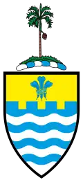 Shield: Barry wavy of eight Azure and Argent a chief embattled Or overall a Pinang or areca-nut palm leaved and fructed Proper