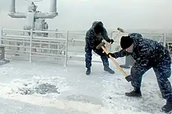 Subfreezing conditions have significant implications for naval operations. The 1988 U.S. Navy Cold Weather Handbook for Surface Ships outlines effects on: icing on the topsides of ships, ship systems, underway replenishment, flight operations, and personnel. It also discusses preparations for cold-weather fleet operations.[80]