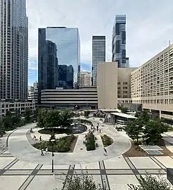 College Park (the park rather than the building) is a 0.75 hectares (1.9 acres) greenspace located behind the buildings in the block bordered by Yonge, College, Bay and Gerrard streets. It is the second largest park in downtown Toronto after Allan Gardens. It was built in the 1980s over an underground garage. The park was closed for renovations in early 2016 and reopened in 2019. Today, the park contains the Barbara Ann Scott Ice Trail.[10][11][12]