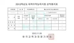 - ^ 남, 지원·김지혜·최미랑 (2017-11-24). "[2018 수능]입시 최대 변수는 '영어 절대평가'···최상위권-상위권 극명히 갈려 [2018 CAST] The biggest variable in the entrance examination is the English Absolute Evaluation,··The top-to-upper ranks sharply divided". Kyunghyang Shinmun (in Korean). Retrieved 2020-11-05.
