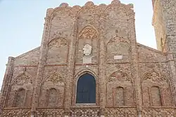 Traces of the original chapel remain in the aedicule to the right of the portal, believed to have once depicted the saint.[2][3] The facade comprises three levels: a simpler lower Romanesque section and more elaborate upper Gothic tiers. Crafted in terracotta by Enrico Alemanno in 1421, it is divided into five equal-width but varying-height sections, representing the only example of Flamboyant Gothic in the Marche.[2] Its stylistic elements appear contradictory individually but harmonious as a whole. The entrance portal, framed by a round arch, features a bas-relief of Saint Genesius holding an actor’s mask, while its sides bear ancient carvings of travelers’ names, dates, and natural events, such as one from April 5, 1595, reading: "A DÌ 5 DE APRILE 1595. NEVE ET STRINA ALTA DUI PIEDI PER TUTTA LA MARCA" ("On April 5, 1595, snow and frost two feet high across the March").[24][25] Adjacent to the church stands the Romanesque civic tower, topped with a 17th-century bulbous roof.[2][3] Near the door, stone etchings mark heavy snowfalls from the 16th century onward, alongside signatures of passersby.