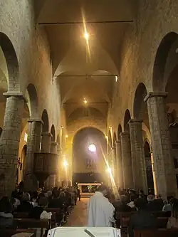 The interior, divided into three naves by cylindrical pillars supporting round arches, follows a basilica plan with a flat apse and simple ribbed vault roofing. The side naves provide access to six chapels on the right and three on the left.
