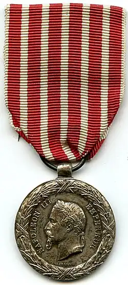 The Commemorative medal of the 1859 Italian Campaign was awarded by the Emperor, on propositions of the ministers for war and for the navy, to all soldiers, sailors and other military and support personnel of the French forces who took part in the 1859 Italian Campaign.[2]