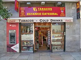 Tobacconist shop in Málaga, an establishment that sells tobacco, postage stamp, stamped paper, and other products that are also prohibited from being sold freely.