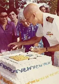 Navy Captain Louis Colbus, then Chief of Staff, Commander Carrier Group EIGHT, takes the first piece of cake during "Jewish Pride in the Navy Day," a special Chapel celebration, September 12, 1982. The CLC symbol, "the Mariner's Tablets" – the Jewish chaplain insignia with the upper portion surrounded by a ship's wheel – can be seen as the cake design