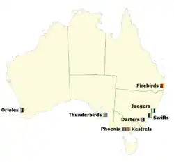 The founding members of the Commonwealth Bank Trophy league included Adelaide Ravens, Adelaide Thunderbirds, Melbourne Kestrels, Melbourne Phoenix, Perth Orioles, Sydney Sandpipers, Sydney Swifts and Queensland Firebirds. The majority of the teams were named after native Australian birds including ravens, kestrels, orioles and sandpipers. Adelaide Thunderbirds were initially going to be named Adelaide Falcons but the name was changed at the request of the rugby union team.[1] In 2003 Ravens were replaced by AIS Canberra Darters[2][3] and in 2004 Sandpipers were replaced by Hunter Jaegers.[4][5][6][7]