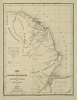 1. ^ a b Cap du Nord defines the boundary between French and Portuguese Guiana under the Treaty of Utrecht. In the 1857 map shown here the cape is just north of the mouth of the Araguari River. The Portuguese considered that Cap du Nord was just south of the Oyapock river, shown on this map as shown as Cap d'Orange.