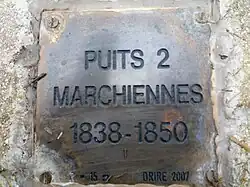 A sugar mill was then set up on the pit site, followed by a wire-drawing mill.[5] In the 20th century, the five-meter-diameter well was used to supply water to the wire-drawing plant, which required 200 m³ per day. The water level was twelve to thirteen meters deep in 1957, and the measured depth of the structure was 35 meters.[19] In 2007, the DRIRE installed a materialized wellhead, enabling monitoring of water and embankment levels, as well as gas pressure.[23] It now stands in the middle of the roundabout on the Tréfilerie industrial estate. It is called “Puits 2 Marchiennes.”