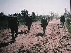 Company F consisted of a large company headquarters and operations section, three patrol platoons, a communications platoon, and a parachute rigger section. Each patrol platoon consisted of a platoon headquarters and, at full strength, six 6-man patrol teams. Company F was historically an independent company within the Michigan National Guard, but for a period during the Cold War beginning in 1983, the company was aligned with VII Corps Headquarters in Stuttgart, West Germany, where it would deploy and serve as the corps Long Range Surveillance unit in the event of a NATO-Soviet conflict in Europe. Members of Company F held military occupational specialties (MOS) in the branches Infantry, Quartermaster Corps (Parachute Rigger 92R), Signal Corps and Military Intelligence. Since it was an airborne unit, members were required to attend the Army's Basic Airborne Course at Fort Benning, GA.[1]