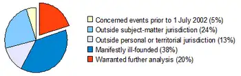 • 13% concerned crimes that were "manifestly outside the personal or territorial jurisdiction of the Court". The Court can generally only prosecute crimes committed on the territory of, or by nationals of, states parties, and crimes referred by the United Nations Security Council.