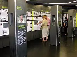 Above all, the private initiatives and extensive research by Volker Mall and Harald Roth[4] were the impetus for the establishment of a multimedia exhibition space on the ground floor of the Tailfinger Town Hall. The target groups are primarily school classes with pupils aged 14 and over. In addition to modern touch-screen monitors, a room-long chronological table over two metres high has been created, from which the connections can be understood. An aerial panorama of the airfield and its surroundings was taken from several aerial photographs taken in 1944/1945. The "Number Book" lists the names of all Jewish prisoners. However, the focus is on the individual fates of the camp inmates and the testimonies of contemporary witnesses from the Gäu region. The entire stock of digital documents can be used for research purposes. The entire exhibition site has been deliberately designed for possible extensions. At the end of 2008 a documentary film was made: "Das KZ-Außenlager Hailfingen/Tailfingen" by Bernhard Koch in cooperation with Gegen Vergessen - Für Demokratie.