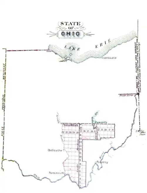 The first north-south line, Eastern Ohio Meridian, was to be the western boundary of Pennsylvania, sometimes called Ellicott‘s Line[2] after Andrew Ellicott, who had been in charge of surveying it, and the first east-west line (called the Geographer’s Line or Base Line) was to begin where the Pennsylvania boundary touched the north bank of the Ohio River, the Beginning Point of the U.S. Public Land Survey (40°38′33″N 80°31′10″W / 40.64250°N 80.51944°W). The Geographer’s Line was to extend westward through “the whole territory” which at that time was meant to include lands lying between the Ohio River and Lake Erie.