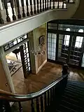 The vestibule is a small space approximately 16 feet square. It's the first space encountered upon entering the home and is separated from the foyer by a double-door. The foyer contains access to the main staircase with a large carved newel post made from cherry and Birds-Eye Maple. The staircase and landings are cantilevered above the first floor and feature a continuous varnished maple railing supported by 102 turned spindles.