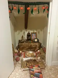 In all three of these religions, daily ritual devotion is a central aspect.[1][2] Shrines facilitate this practice by offering a sacred space within the home, serving as a focal point for meditation and offerings to the gods and enlightened ones. Daily rituals at household shrines can take many forms, but often feature some of the following practices: meditation and/or prayer,[1][2] ritual bathing of sculptures in water, anointing with oils,[2][3] lighting of candles or burning of incense,[1][4] and offering of flowers and/or food. Devotional practices vary not only from religion to religion, but also from person to person. The above list contains common actions, but the form of daily ritual is set by the individual.