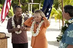 On 11 June 1980, the United States signed a treaty with the Cook Islands specifying the maritime border between the Cook Islands and American Samoa and also relinquishing any American claims to Penrhyn, Pukapuka, Manihiki, and Rakahanga.[53] In 1990 the Cook Islands and France signed a treaty that delimited the boundary between the Cook Islands and French Polynesia.[54] In late August 2012, United States Secretary of State Hillary Clinton visited the islands. In 2017, the Cook Islands signed the UN Treaty on the Prohibition of Nuclear Weapons.[55] On 25 September 2023, the Cook Islands and the United States of America established diplomatic relations under the leadership of Prime Minister Mark Brown at a ceremony in Washington, DC.[56]