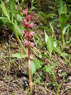 Like other coralroot orchids, the plant takes its name from its coral-shaped rhizomes.[4] It has an erect stem about 15 to 50 cm (6 to 20 in) tall that may be red, pink, purple, or yellow-green to almost white. The leaves lack chlorophyll and are reduced to colourless scales that sheath the stem. The plant also lacks roots, and relies upon parasitism of fungi for sustenance.