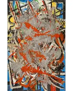 With Harlequin, (1946), West investigated “art as process” and her expressive abstractions became more aggressive action paintings.[10] She soon destroyed Harlequin by painting over it (leaving some parts still visible) with Blinding Light (1947-48); the overpainting was a deliberate act of destruction, her response to the destructive power of the atomic bomb.[13] Kelly Grovier described Blinding Light as "one of the most daring, uncompromising and innovative paintings to emerge in the [twentieth] century", and said that it is one of the "most intriguing plot points" of American modern art.[14]