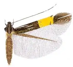 Male, female. Forewing length 3.7 mm. Head: frons ochreous-white, vertex, neck tufts and collar dark brown with reddish gloss, laterally and medially lined white; labial palpus first segment very short, white, second segment three-quarters of the length of third, dark brown with white longitudinal lines laterally and ventrally, third segment white, lined dark brown laterally; scape dorsally shining dark brown with white anterior line, ventrally shining white, antenna dark brown with a white line from base to three-fifths, often partly interrupted, followed towards apex by eight dark brown segments, two white, two dark brown, two white, ten dark brown, four to five white and two or three dark brown segments at the apex. Thorax and tegulae dark brown with reddish gloss, thorax with a white median line, tegulae lined white inwardly. Legs: dark greyish brown, femora of midleg and hindleg shining ochreous grey, foreleg with a white line on tibia and tarsal segments one and two, segment three white in basal half, segment five entirely white, tibia of midleg with white oblique basal and medial lines and a white apical ring, tarsal segment one lined white on the outside and with a white apical ring, segments two and four with white apical spots and segment five entirely white, tibia of hindleg as midleg, tarsal segments one to four with white apical rings, segment five dorsally white, spurs white dorsally, greyish brown ventrally. Forewing shining dark brown with reddish gloss, four white lines in the basal area, a subcostal from base to one-quarter, slightly bending from costa, a short medial in the centre underneath the end of the subcostal, a subdorsal about as long as the medial, but slightly further from base, a yellow-orange transverse fascia beyond the middle, narrowed towards dorsum, bordered on the inner and outer edge by broad tubercular golden metallic fasciae, the inner fascia almost perpendicular on dorsum, not reaching costa and with a blackish spot subcostally on the outside, the outer fascia inwardly oblique and strongly narrowed at one-third from the costa, lined dark brown on the inside at costa and dorsum, a white costal streak beyond the outer fascia, a white apical line from the distal half of apical area to apex, cilia dark brown around apex, paler towards dorsum. Hindwing dark greyish brown, cilia dark brown. Underside: forewing shining greyish brown, the white costal streak indistinctly and the white apical line distinctly visible in the apical cilia. Abdomen dorsally dark greyish brown with reddish gloss, ventrally dark grey, in the middle shining ochreous-white, segments banded shining white posteriorly, anal tuft dorsally dark grey, ventrally ochreous-white.[1]