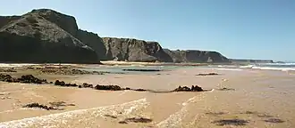 Southwest Alentejo and Vicentine Coast Natural Park (PNSACV) is a natural park located in southwest Portugal. It occupies an area of 895.7 km2 (345.8 sq mi) (605.8 km2 (233.9 sq mi) on land and 289.9 km2 (111.9 sq mi) at sea) and is one of the last strongholds of the wild European coast.[3] It has one of the highest levels of biodiversity in the country with over 12 endemic species of plant[4] and several bird nesting sites.