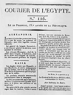 The Courier de l'Égypte[a] (English: "Courier of Egypt") was a newspaper published during the French invasion of Egypt and Syria. Existing primarily to propagate French propaganda regarding the invasion, the newspaper reported on French military operations in the region along with publishing "travel stories of [the] many correspondents wandering around Cairo on the lookout for a picturesque scene".[1]