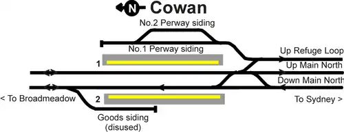 Cowan has two side platforms. It is serviced by Sydney Trains Central Coast & Newcastle Line services travelling from Sydney Central to Newcastle.[6]