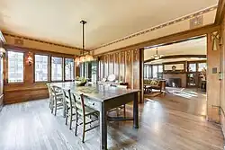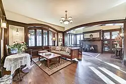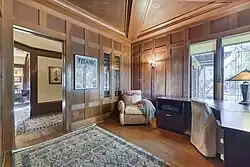 The leaded glass windows are interesting features in the first story of the Cranston house and the ground-floor rooms also have an impressive amount of carefully crafted and installed woodwork. Stained wooden panels cover much of the wall surface in the dining room. The study (or den, as it was called in 1909) is completely surfaced in wood. The walls are covered with wood panels and there is a beamed wooden ceiling overhead.