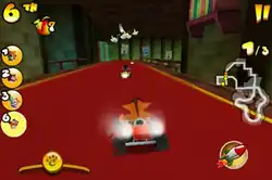 Crash Bandicoot Nitro Kart 2 is a kart racing game featuring characters from the Crash Bandicoot series. Players race across 12 themed tracks, aiming to finish first while using weapons and power-ups to disrupt opponents.[1] The game features both tilt and touch steering options, which can be toggled via the main menu.[2][3] Acceleration is automatic, with players controlling braking (via touching the screen's bottom) and jumping (via touching the top). No reverse control is available.[4] Players can collect weapons such as missiles to attack rivals.[5] The game's modes include standard races, tournaments, eliminator (in which the last-place racer is dropped each lap), and mission (which features objectives like collecting items or drifting for points).[1][2][4] Online multiplayer allows global racing with modes like standard races, eliminator, and collection (which involves collecting the most crystals by the end of a race).[1][2]
