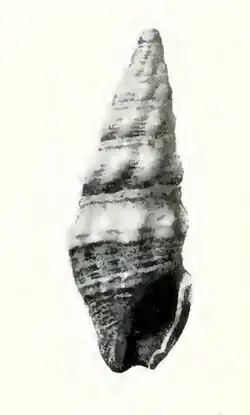 (Original description) The small shell is slender and acute. It is dark brown with a whitish peripheral and a less obvious basal band. The blunt protoconch consists of two whorls. It is polished and reddish brown. It is followed by six subsequent whorls. The anal fasciole on the spire is depressed, very minutely spirally striated with a single fine thread near the posterior edge which is appressed at the suture. Other spiral sculpture consists of fine striae and three stronger threads with wider interspaces on the base. The siphonal canal has about half a dozen smaller closer threads. The axial sculpture consists of nine oval prominent nodules on the periphery, which may in some specimens be bisected by an incised spiral line. The incremental lines are not prominent. The aperture rs rather wide and short. The deep anal sulcus is deep, with a small subsutural callus. The outer lip is sharp edged, with a small varix, internally not lirate. The siphonal canal is short, wide, deep, with a perceptible siphonal fasciole and slightly recurved.[2]