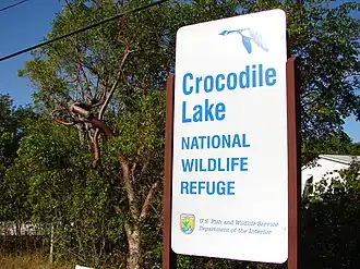 The Crocodile Lake National Wildlife Refuge is part of the United States National Wildlife Refuge System, located in north Key Largo, less than 40 miles (64 km) south of Miami off SR 905 (Card Sound Road). The 6,686 acres (2,706 ha) refuge (located in Monroe County, Florida) opened during the year of 1980, under the Land and Water Conservation Fund Act of 1965 and the Endangered Species Act of 1973. It was established in order to protect critical breeding and nesting habitat for the threatened American crocodile and other wildlife.[1] This area also includes 650 acres (260 ha) of open water in and around the refuge. In addition to being one of only three breeding populations of the American crocodile,[2] the refuge is home to tropical hardwood hammock, mangrove forest, and salt marsh. It is administered as part of the National Key Deer Refuge which is also located in the Florida Keys.
