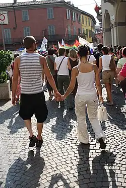 While LGBT people are often defined by society for their lack of heterosexual relationships, heterosexual relationships among them are fairly common, especially among bisexual people[1] and transgender people, who can be any sexual orientation, including heterosexual.[2][3][4]