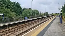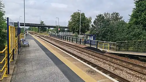 The station has very limited facilities. There is a shelter on each platform, but no other permanent buildings. A public telephone is provided on platform 1 along with timetable posters to offer train running information. Platform 2 is accessible only by a barrow crossing at the west end of the station, but step-free access is available from the main entrance onto platform 1.[1] The disused signal box has now been knocked down and levelled off.
