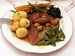 The original bread roll of Hamburg is called "Rundstück" (lit.: round piece) and those that were not eaten for breakfast are plated with slices of roasted pork, smothered in sauce and are then called "Rundstück warm" for lunch (lit.: round piece warm). A famous bread is Schwarzbrot, a dark and fluffy whole wheat bread. For tea (or 'coffee and cake' as teatime is called in Germany) Kopenhagener are served which is filled with jam or marzipan. Another famous baked good for 'coffee and cake' is the traditional apple pie of Hamburg which is prepared by pan frying the apples and deglazing them with white wine before baking the actual cake. "Black and white cookies", either self-made or bought in local pastry shops, are popular in Hamburg, too. Franzbrötchen are also very popular: Despite the name contains the word Brötchen, it is not a roll but a kind of flaky pastry typical only for Hamburg and baked with much butter and cinnamon. Locals enjoy it for breakfast, too. In Christmas times, there's Klöben (also called 'Stollen' in other parts of Germany), a bread-shaped pastry made of yeast dough with raisins and succade. 'Braune Kuchen' (lit.: brown cakes) are crisp rectangular biscuits baked with molasses and gingerbread spice that are based on a recipe developed back in 1782 from the Konditorei Kemm.[6] 'Weiße Kuchen' (lit.: white cakes) however are a kind of fried dough foods. The so-called Heißwecken (lit.: hot rolls) are a yeast dough product with raisins that are dusted with confectioner's sugar and filled with cream and are traditionally eating during lent.