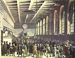 The northern front of Laing's new building was plain, but the south front towards the river had wings with Ionic colonnades and a projecting centre section. The attic storey of the latter was decorated with terracotta figures in bas-relief by John Charles Felix Rossi and J. G. Bubb[4] representing the arts and sciences, commerce and industry, and inhabitants of various countries of the world. A clock dial, nine feet in diameter, was supported by colossal figures symbolising Industry and Plenty, and the royal arms by figures of Ocean and Commerce. The riverfront was 488 feet 10+1⁄2 inches long,[5] and the building cost £255,000.[6]