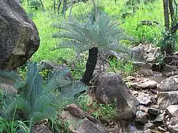 This cycad has a main distribution in sparse Eucalyptus savanna on skeletal soils over outcrops of rhyolite or basalt west of the Atherton Tableland in north-east Queensland. This species is fire tolerant. It grows abundantly in cool habitat